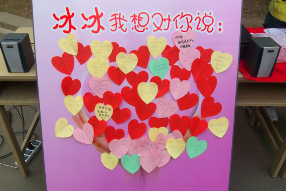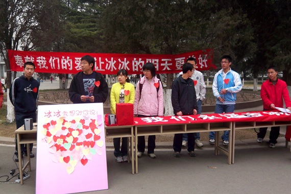 李冰冰的同学们在南区小绿园广场,在二号公寓楼前,在六食广场等地点设立了募捐点,同学们印制了条幅和宣传单,准备了爱心展板,每当有行人路过,这些爱心使者们都会热情地走上前去向行人介绍这位急性骨髓白血病患者的情况,用自己的爱心去感染更多的路人。