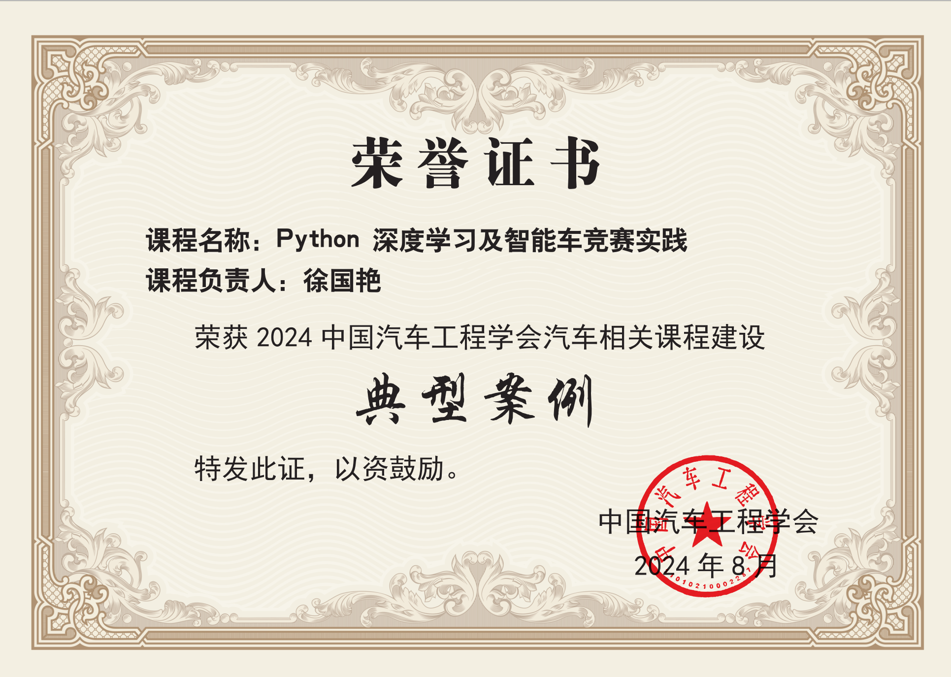 徐国艳老师还与百度公司、踏歌智行科技有限公司合作出版了两本纸质教材和一本数字教材。这些课程和教材很好地推动了人工智能教育的普及、支撑了全国大学生智能汽车竞赛和复合创新型人才的培养。徐国艳老师也因此获评为2024年度百度飞桨年度优秀教师。