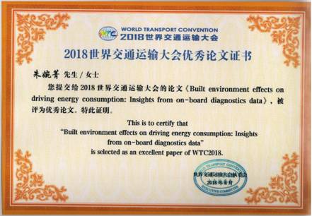 2018年6月18日至21日,世界交通运输大会(World TransportConvention, 2018)在北京国家会议中心举行,经过大会论文宣读和组委会专家评选,我院大四本科生朱婉菁(指导老师:丁川)完成的学术论文“Built environment effectson driving energy consumption: Insights from on-board diagnostics data”获评2018世界交通运输大会优秀论文。此次大会优秀论文录取率为5%。