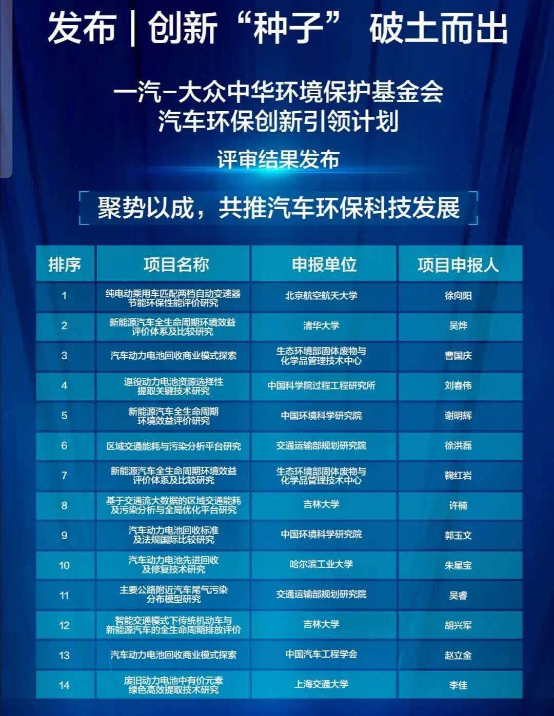 一汽-大众中华环境保护基金会汽车环保创新引领计划由一汽-大众联合中华环境保护基金会共同发起。旨在通过公益的力量推动平台合作,推进创新科技成果转化,引导社会各界关注中国汽车环保科技的创新与发展。来自生态环境系统相关机构、高校科研院所、汽车企业和专业汽车媒体的评审专家共同对线上答辩的项目从科研价值、成果转化前景、商业模式创新、绿色发展等多个维度进行了综合评审,并提出了积极而具有前瞻性的建议。