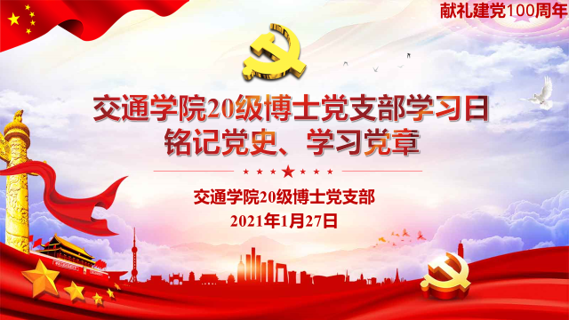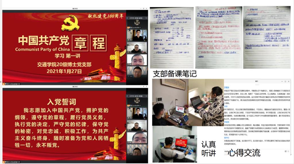 为深入贯彻落实习近平总书记关于学习“四史”的指示精神,以更好的精神面貌迎接建党100周年,2021年1月27日下午,交通学院20级博士党支部开展了“铭记党史、学习党章”线上学习活动,党支部全体党员及积极分子参与了本次学习。