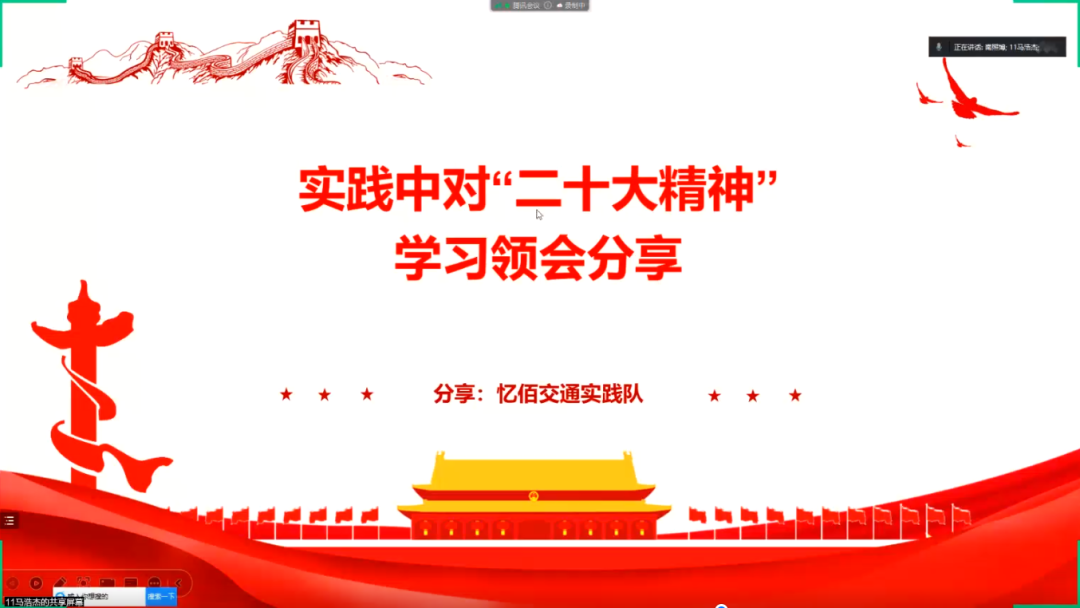接着,交通学院忆佰交通、乘九御风、交筑未来寒假社会实践队学生党员代表依次发言,交流展示在社会实践过程中关于党的二十大精神学习心得和实践成果。自由交流环节中,学生党员代表徐婕和王现依次分享寒假社会实践感受。两位同学结合寒假社会实践经历和自身成长经历,就党的二十大精神、乡村振兴、脱贫攻坚等主题进行探讨。