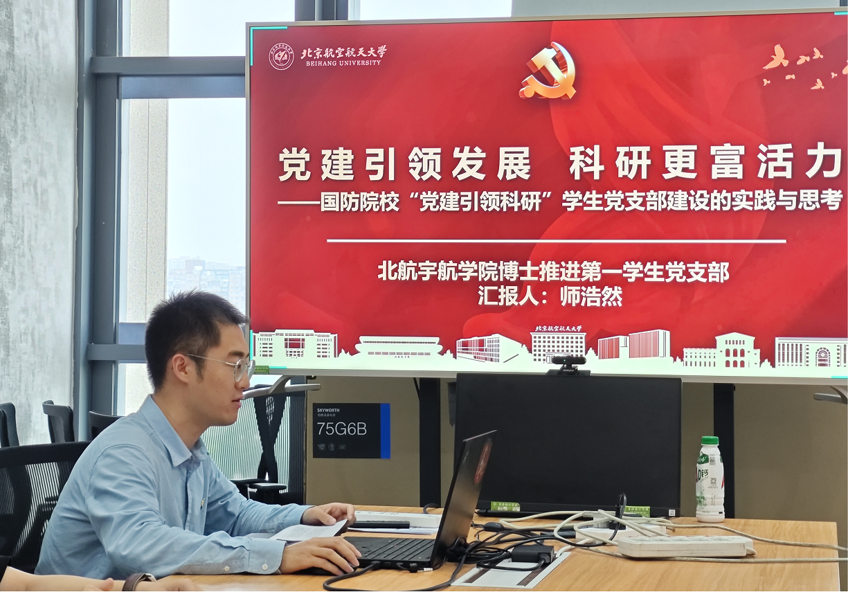 交流结束后,会议邀请获批第三批全国高校“百个研究生样板党支部”的北航宇航学院博士推进第一学生党支部书记师浩然进行支部建设分享。师浩然以“党建引领发展,科研更富活力——国防院校“党建引领科研”学生党支部建设的实践与思考”为主题,分别从支部概况、日常建设和特色工作案例三方面进行介绍,支部依托北航航天推进技术课题组而成立,始终以习近平新时代中国特色社会主义思想为指导,不断追求建设政治过硬、表率突出、动力强劲、务实可靠的样板党支部。分享过后,各成员单位对北航宇航学院博士推进第一学生党支部申请加入联盟的事项进行了表决,并全票通过。