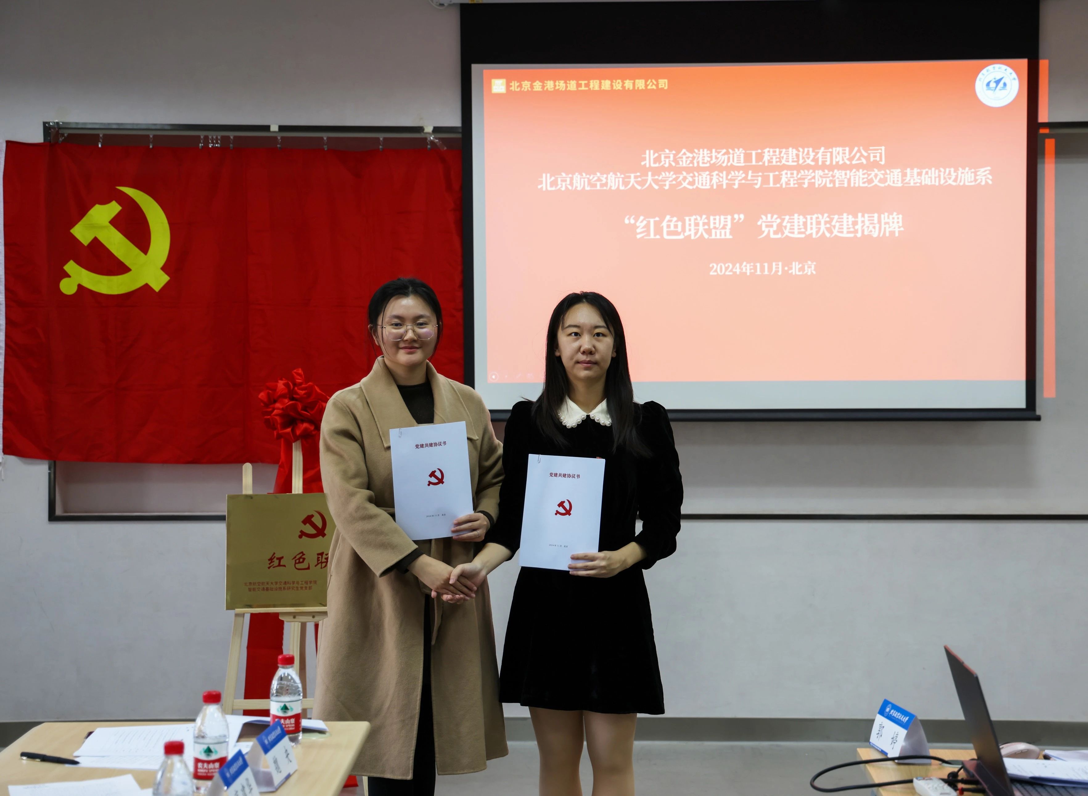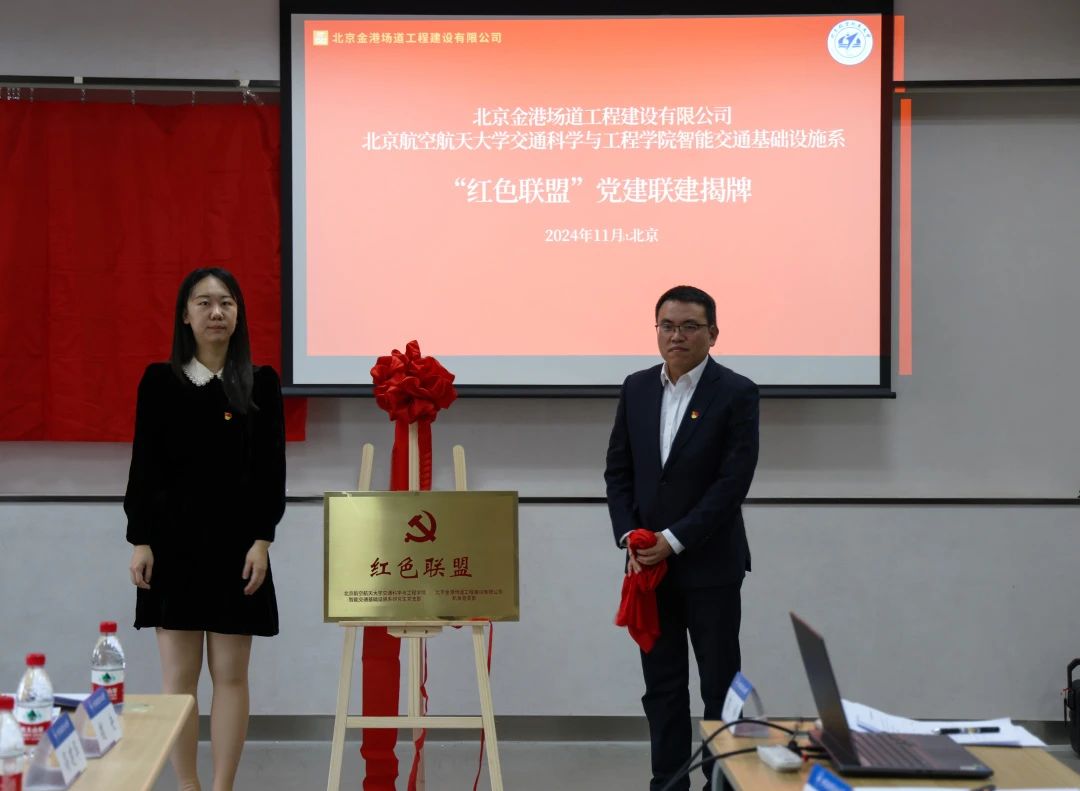 为深化党建引领、加强校企合作、共促产学研深度融合发展,11月19日,交通学院智能交通基础设施系研究生党支部与北京金港场道工程建设有限公司机关党支部在沙河主楼A408召开支部联合共建大会暨“红色联盟”党建联建揭牌仪式,会议主题为“校企合作育新才,优势互补谋发展”。北京金港场道工程建设有限公司机关党支部书记高建华、北京金港场道市场部经理郭淼淼、北京金港场道公司综合办公室主任魏央、交通学院专职辅导员张荣荣、交通学院党建辅导员李延杰、智能交通基础设施系研究生党支部书记郭婷及双方支部党员参会。