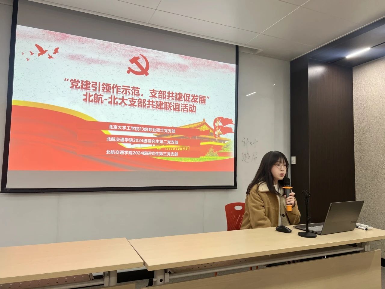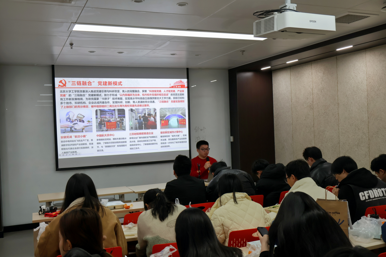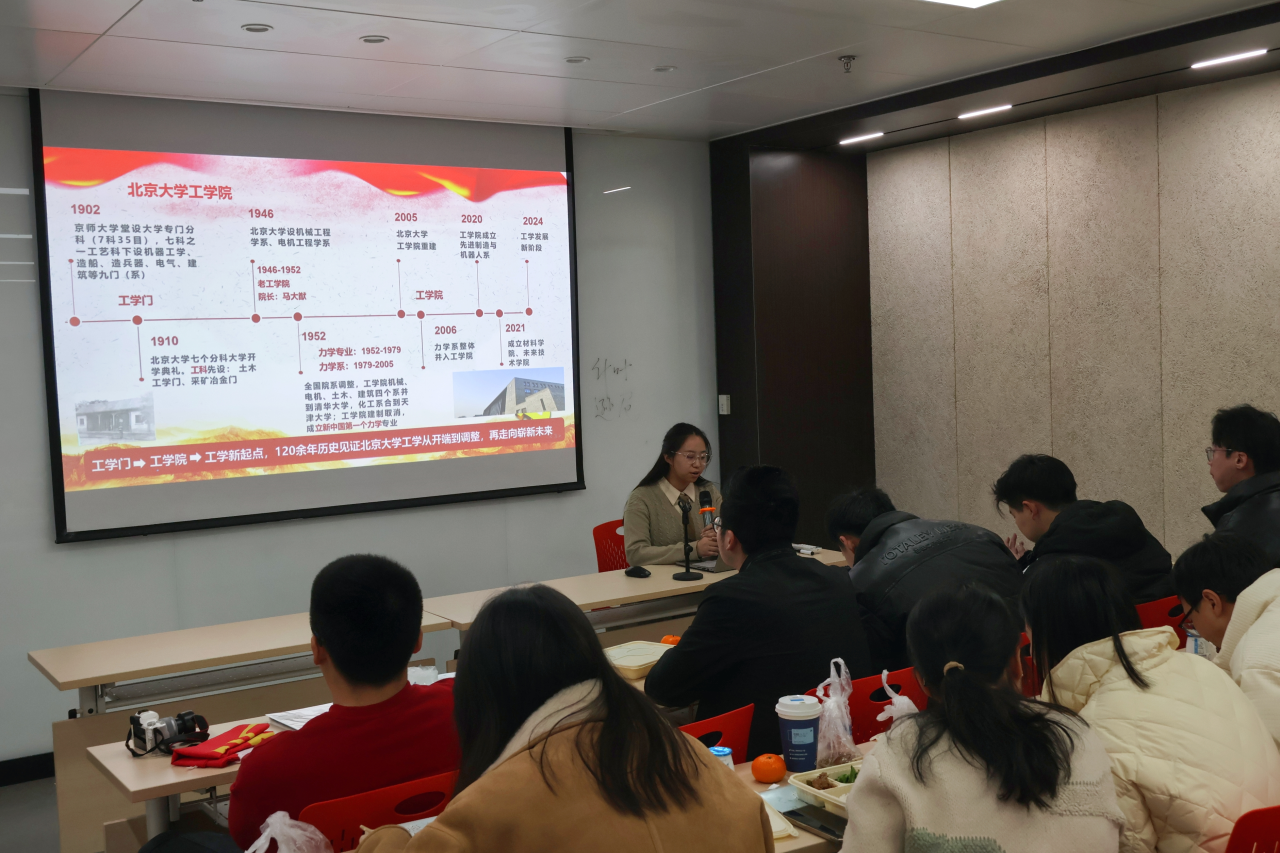 林撼昕讲解了北大工学院探索形成的“科技链-人才链-产业链”的“三链融合”党建新模式,和“以内部循环为主体,校内校外双循环相互促进”的党团主题教育工作新发展格局。北大工学院23级专业硕士党支部书记徐博涵介绍了北大工学的百年历史沿革,分享了党支部推进“学习型、专业型、服务型”支部建设的经验。