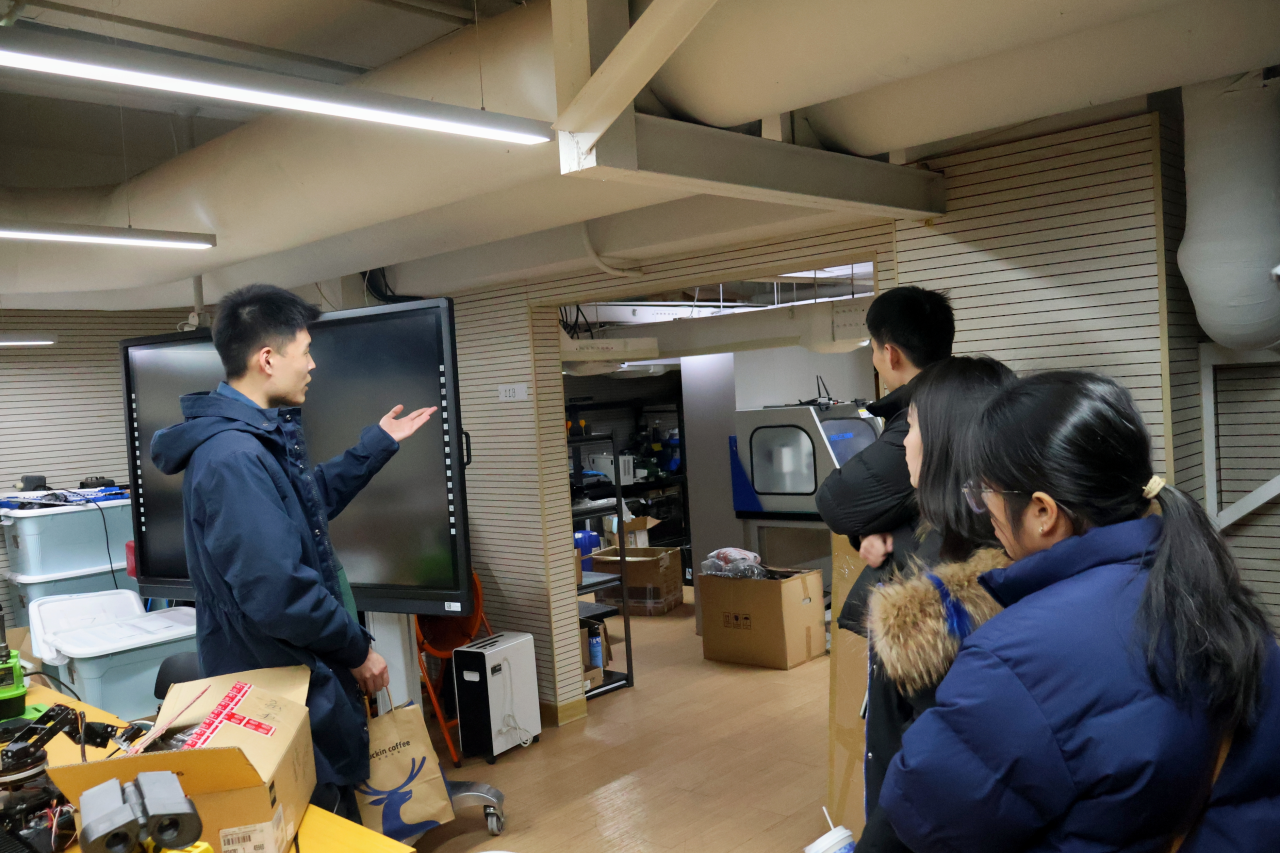 在极客实验室“one-who”无人机实验室,北大工学院22级本科生李昆泰向同学们介绍实验室成果。与会党员们就AI大模型、脑机接口等前沿领域进行交流,并分享各自的研究方向与AI交叉融合发展方向,激发了大家科技报国的责任感和使命感。