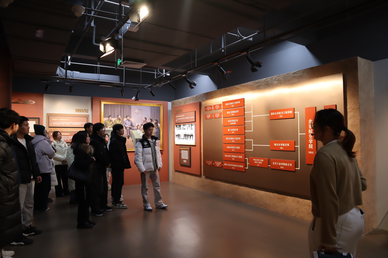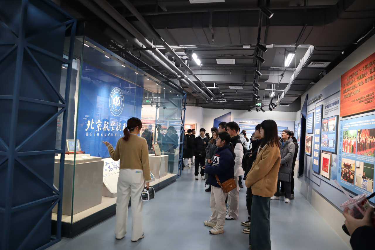 首先两校同学前往参观北航校史馆,深入了解北航的发展历程和科研成果。走进校史馆,迎面而来的便是"空天报国"主题雕塑,以庄严的姿态彰显着北航人的精神追求。校史馆内部丰富的图片和实物展品以空天报国精神为主线,生动地再现了北航七十载的辉煌历程。