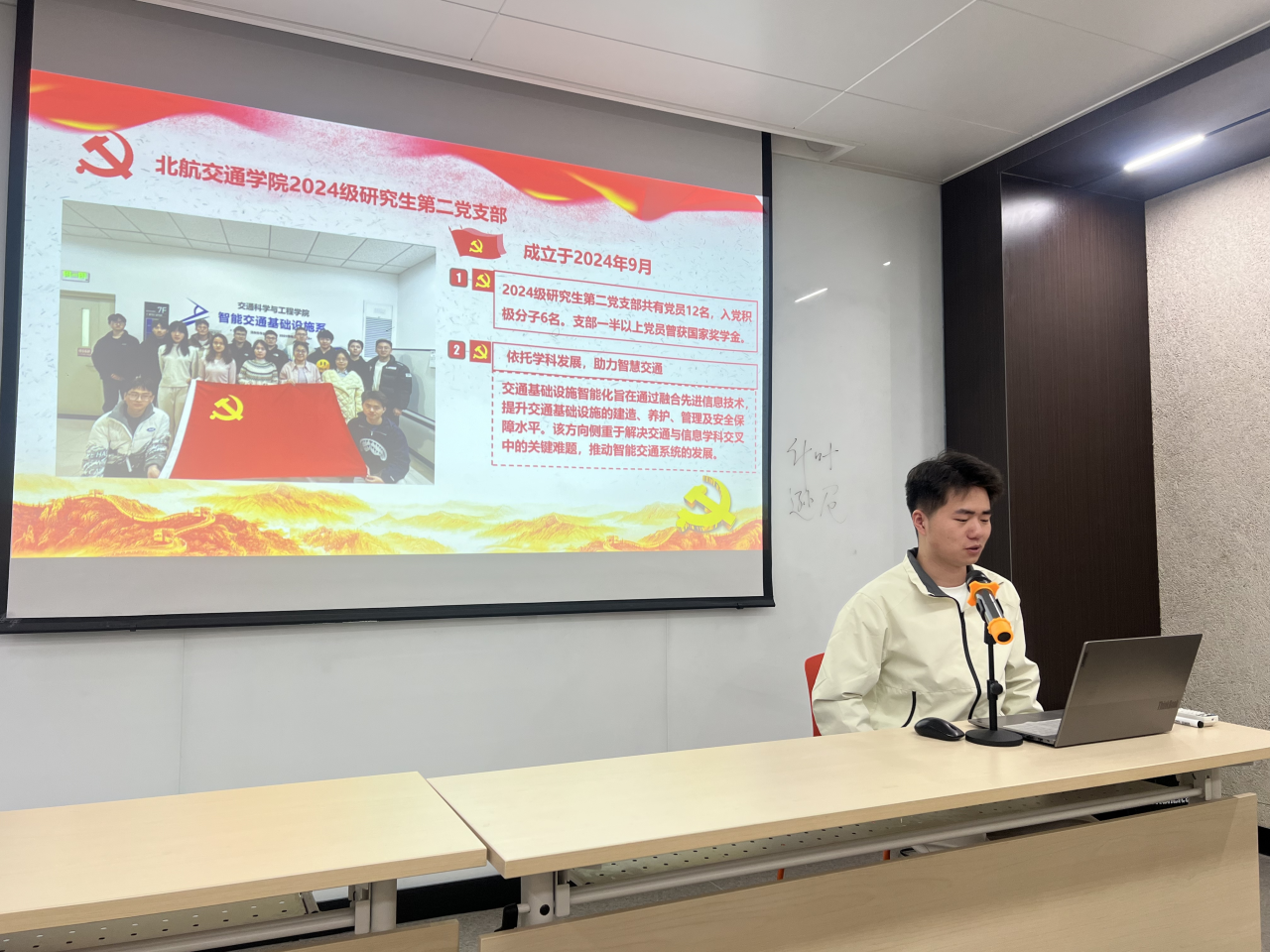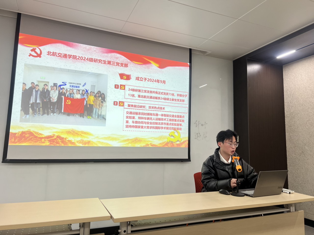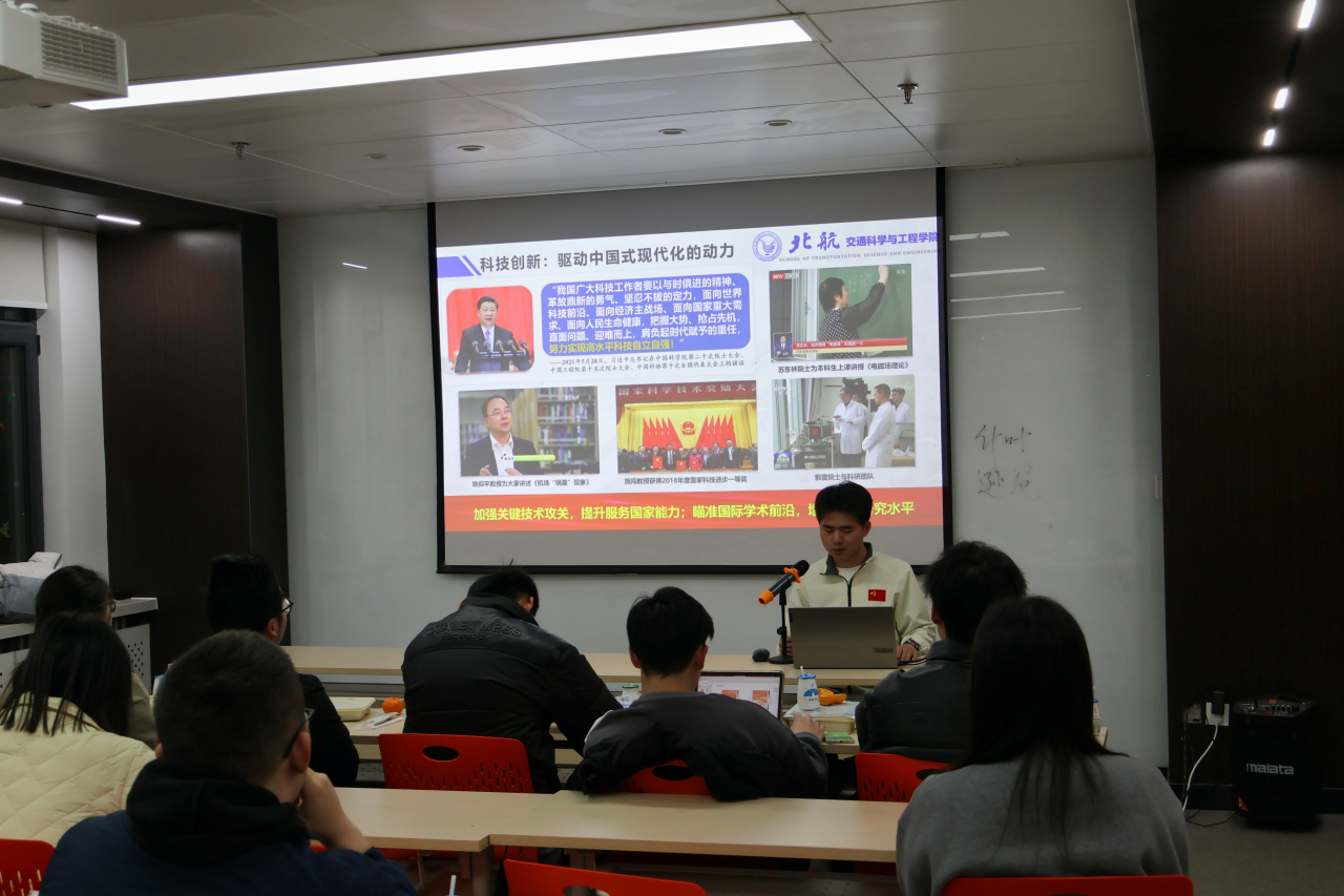 交通学院2024级研究生第二党支部书记李伟、第三党支部书记邢云哲分别介绍支部基本情况和支部内党员研究方向。李伟同志作“改革赋能新征程,科教培育领航人——加速中国式现代化的科技教育人才战略”的主题宣讲。