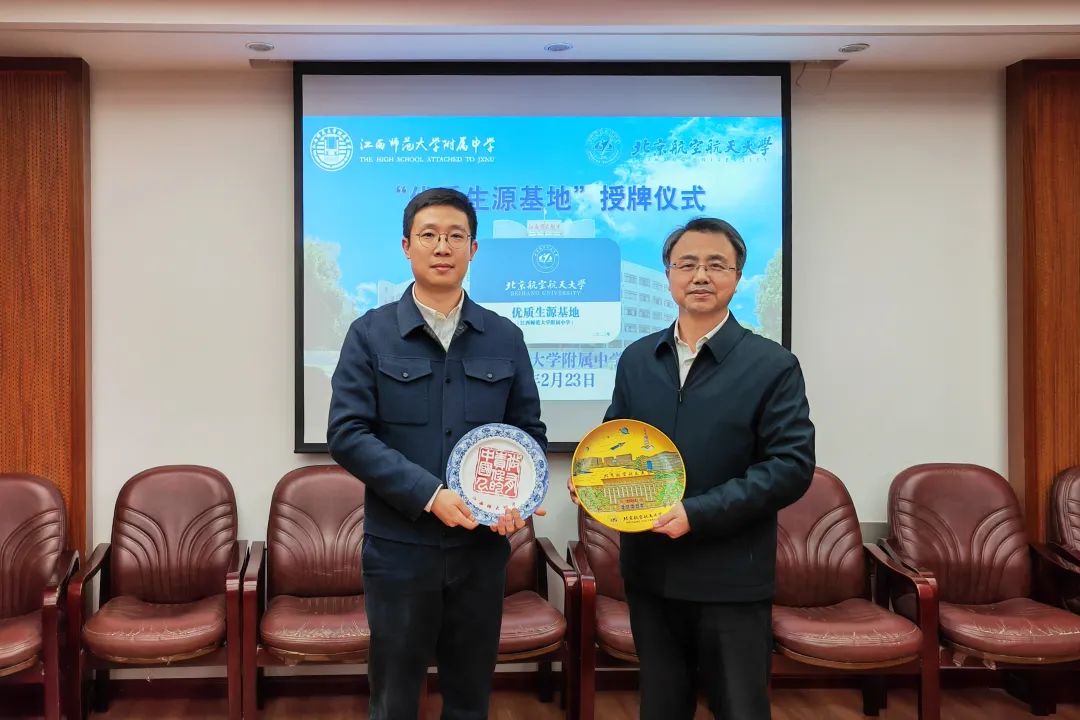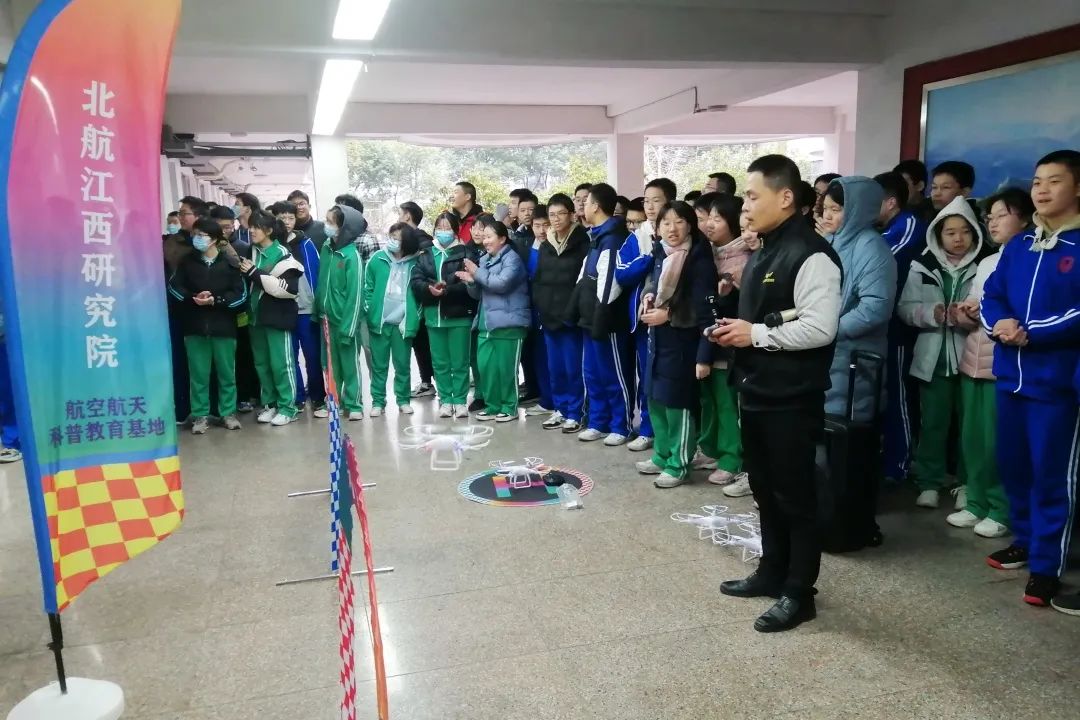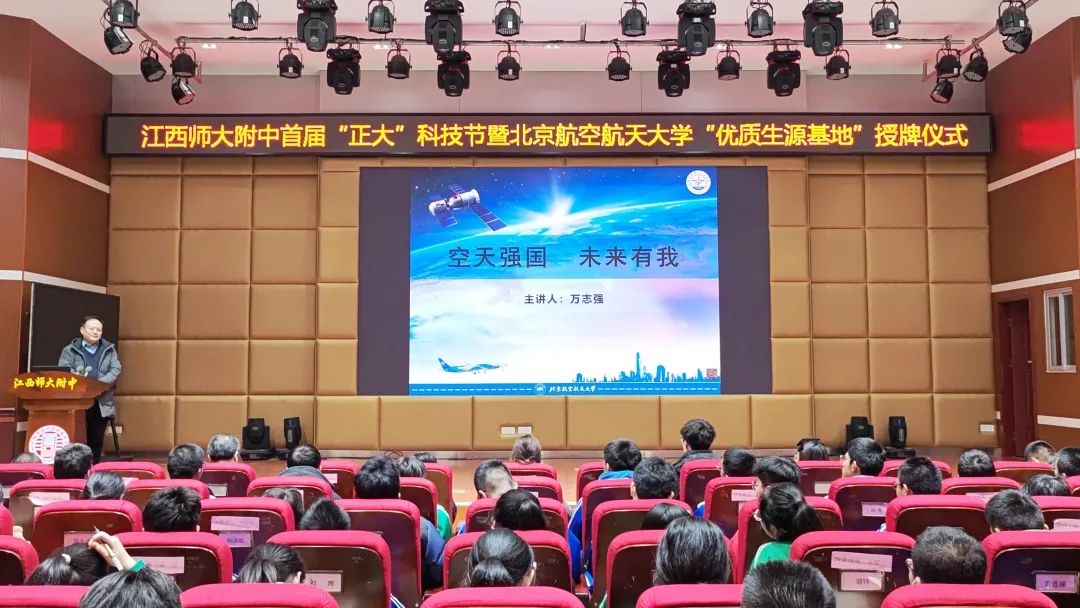 2月23日下午,招生组来到江西师范大学附属中学,双方深入交流了人才培养与校际合作等议题。在江西师范大学附属中学首届“正大”科技节开幕式上,江西研究院为同学们带来了精彩的无人机编队表演,激发了中学生的科技梦想;万志强教授现场为同学们进行了“空天强国,未来有我”主题讲座,系统介绍了各类航空器、航天器及其基本原理,引发了同学们对航空航天的浓厚兴趣;开幕式最后,在全体师生的见证下,双方共同为“优质生源基地”揭牌。