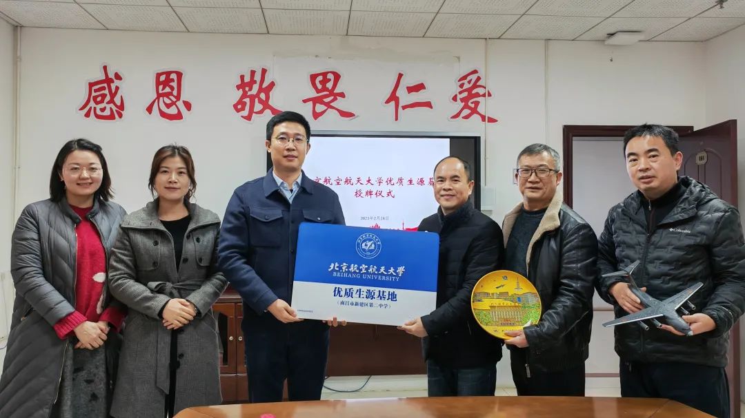 2月24日下午,招生组走进南昌市新建区第二中学,与中学相关领导进行座谈并举行“优质生源基地”授牌仪式。仪式结束后,招生组连线北航招生办公室直播间,陈志英教授以“蕴含科学定律的飞行器设计”为主题,为新建二中的同学们带来一场别开生面的线上科普讲座,深入浅出地介绍了航空航天相关科学知识,受到同学们的一致好评,现场掌声如潮。