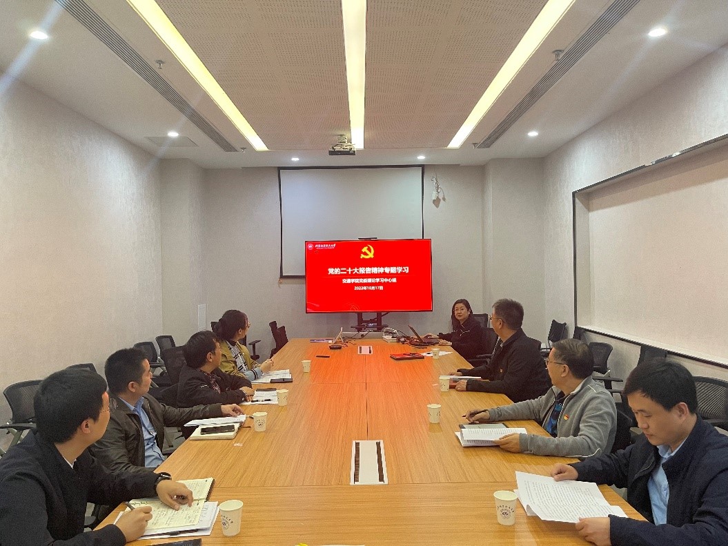 各中心组成员进行交流发言。鲁光泉副院长表示,党的二十大报告从十五个方面系统总结和阐释了过去五年的工作和新时代十年的伟大变革。学习党的二十大精神,需要我们站在历史唯物主义角度,深入学习马克思主义科学理论,深刻领会“六个坚持”,切实贯彻到实际工作的各方面。同时,党的二十大报告中提出科教兴国战略,强调了高校在社会中发挥的作用,我们要进一步推进一流学科建设,加快“交通强国”建设。