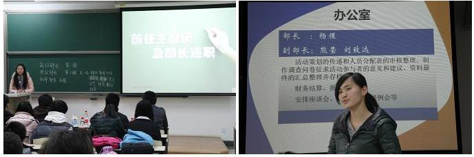 大会主要分为前任部长述职、12级新成员发言、新任部长就职等几个环节。前任学生会主席团及部长对自己的工作做了简单的总结,对新一届就职干部给予了热切的期望。接下来,各部门12级成员发表了自己对所在部门及部长的期望,他们的语言诚恳又不失幽默,将会议气氛推向高潮。之后,新任部长对自己将要担任的职务发表了自己的感想。