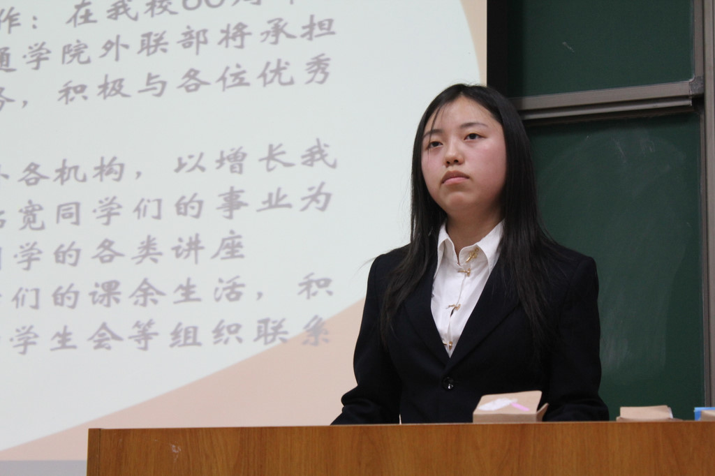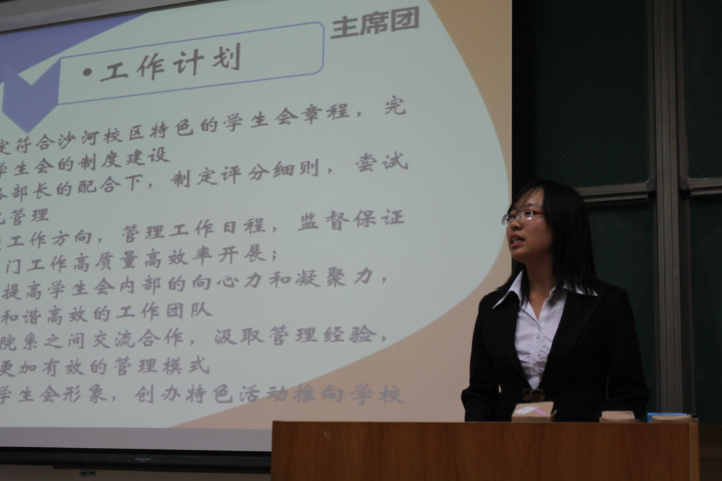 首先,前任学生会部长们在述职报告中对自己的工作做了简单的总结,并对新一届就职干部提出了殷切期望。随后新任部长发表自己的就职演讲。对接下来的工作做了具体的规划,并就本部门今后的发展提出了自己的要求。他们以极高的热忱,申明了坚持为同学服务的宗旨,努力把学生会建设成真正的为同学们服务的平台。会议最后,新成立的新闻中心和社会实践部进行了招新工作。在同学们的积极报名中,学生会换届大会宣告结束。