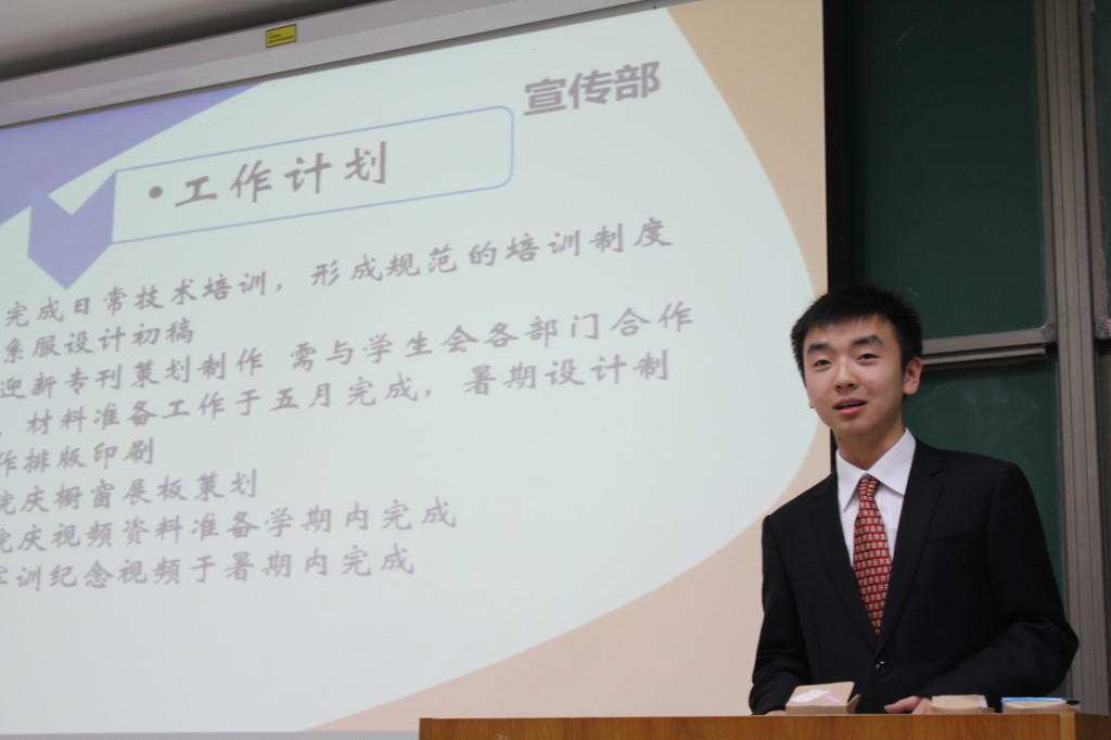 晚上七点三十分,学生会换届仪式正式开始。大会分为三个环节。分别为前任部长述职、新任部长就职和新成立部门招新。