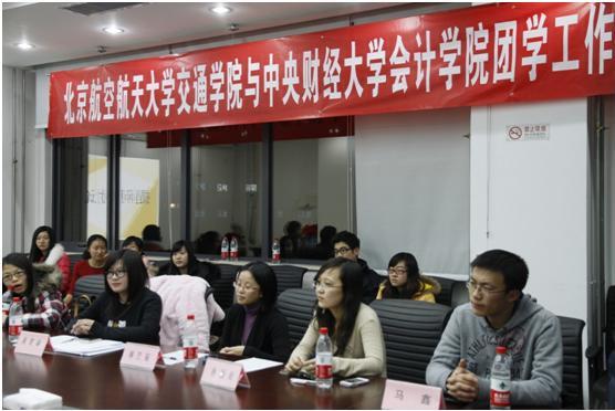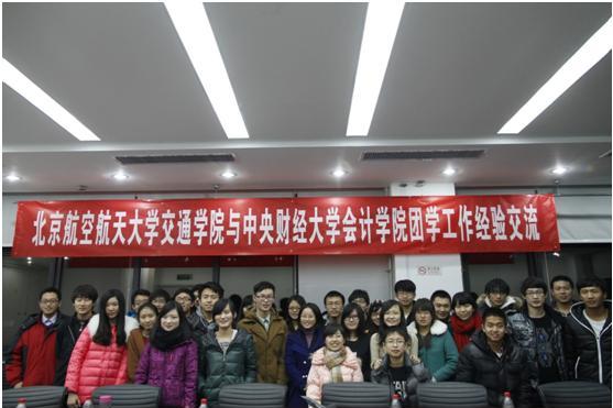 2012年12月5日晚,北航交通科学与工程学院与中央财经大学会计学院的团学交流会成功举办,交通学院2011级辅导员屈珊老师、中央财经大学会计学院团总支书记林艺茹老师、以及两院学生会成员参加了此次交流会。