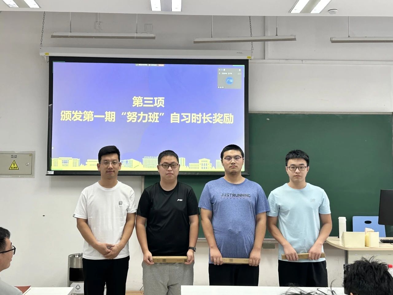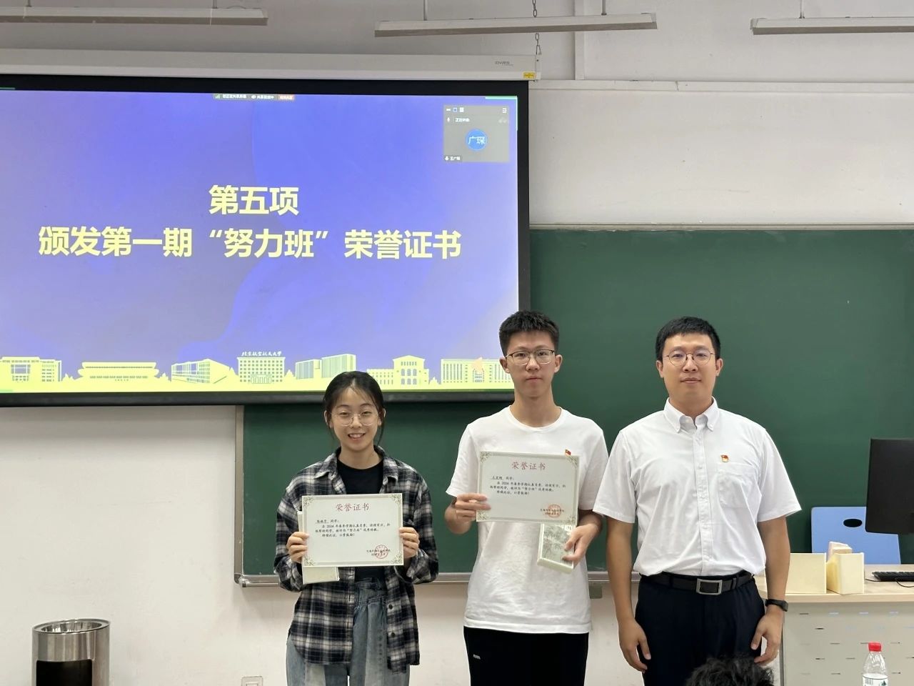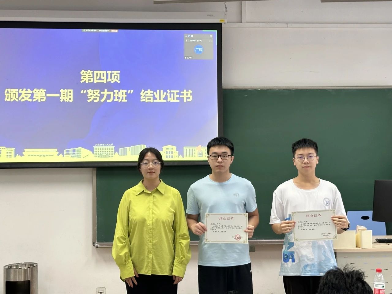 在第一期“努力班”中,部分学员在集体自习等学业帮扶活动中表现突出,学业成绩进步明显,郭祖博、张迎晨和张荣荣分办为学员代表、助教代表颁发了自习时长奖励、结业证书及荣誉证书,鼓励同学们向榜样学习,提升学习热情,提高自主学习能力。