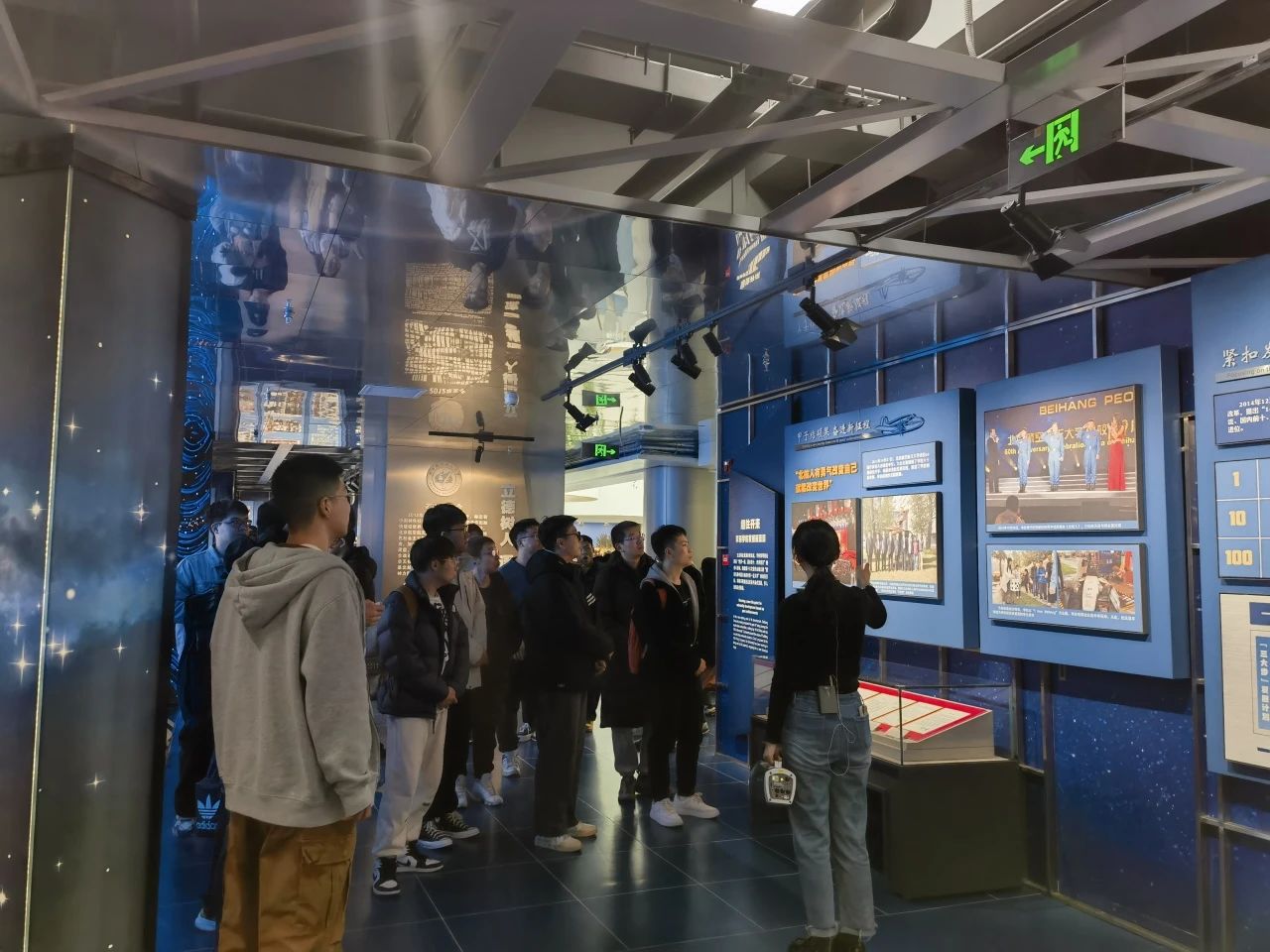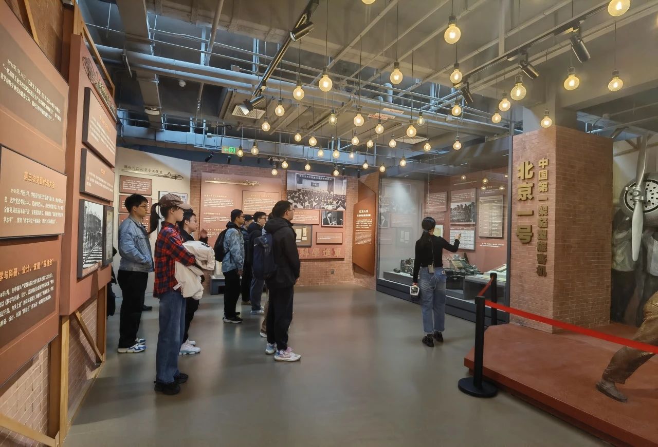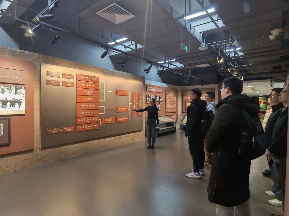 在讲解员的引导下,同学们首先参观了位于校史馆第二层的“伟大觉醒,孕育新生”序厅,回顾了20世纪初,国家危难、民族危亡之时,无数爱国志士胸怀航空救国梦,在复杂的时代大环境下,兴办航空实业、探索航空教育。抗美援朝战争爆发后,为响应国家“急需办一所航空大学”的需求,清华大学、西北工学院等八所高等院校合力构建北京航空学院。在成立之初,航空救国的爱国精神就已化作红色基因,融入北航。