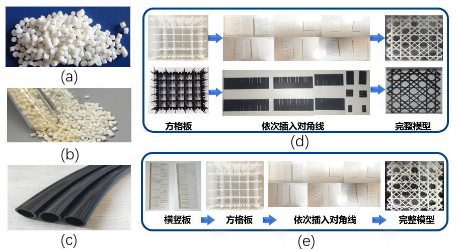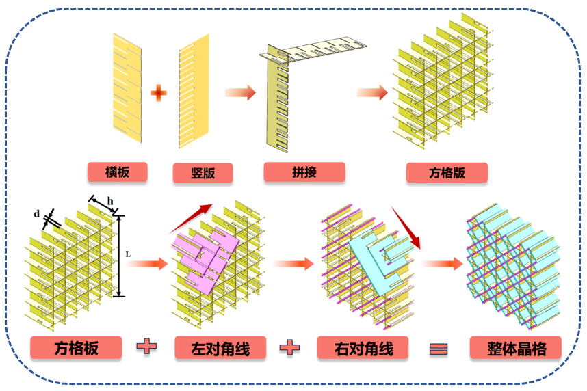 本项目受深海玻璃海绵骨架结构启发,将“仿海绵结构”与“可组装超材料”结合,设计出具有完全对称胞元的仿生点阵结构(BLS)(如图 1)和全拆、半拆两种拼装方案(如图 2),并通过3D打印技术选用TPU、PLA和PA11材料制备半拆A、半拆B、全拆C三种试样,如图 3。经准静态压缩试验和有限元模拟(如图 4)验证,该可组装力学超材料吸能性能良好,比吸能和承载能力高,突破了传统超材料应用局限,为可编程力学超材料设计提供新途径。