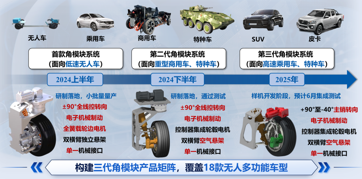 团队针对新能源汽车底盘的线控智能化需求,创新性地构建了一套高集成度、低簧下质量、强操稳性、可与底盘即插即用的三代角模块产品技术体系。