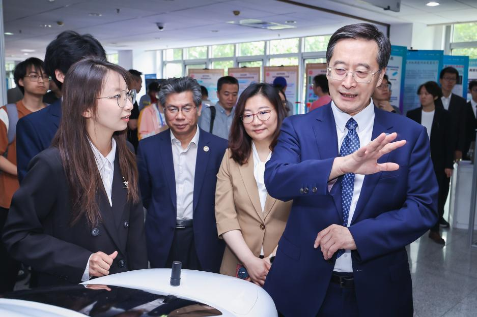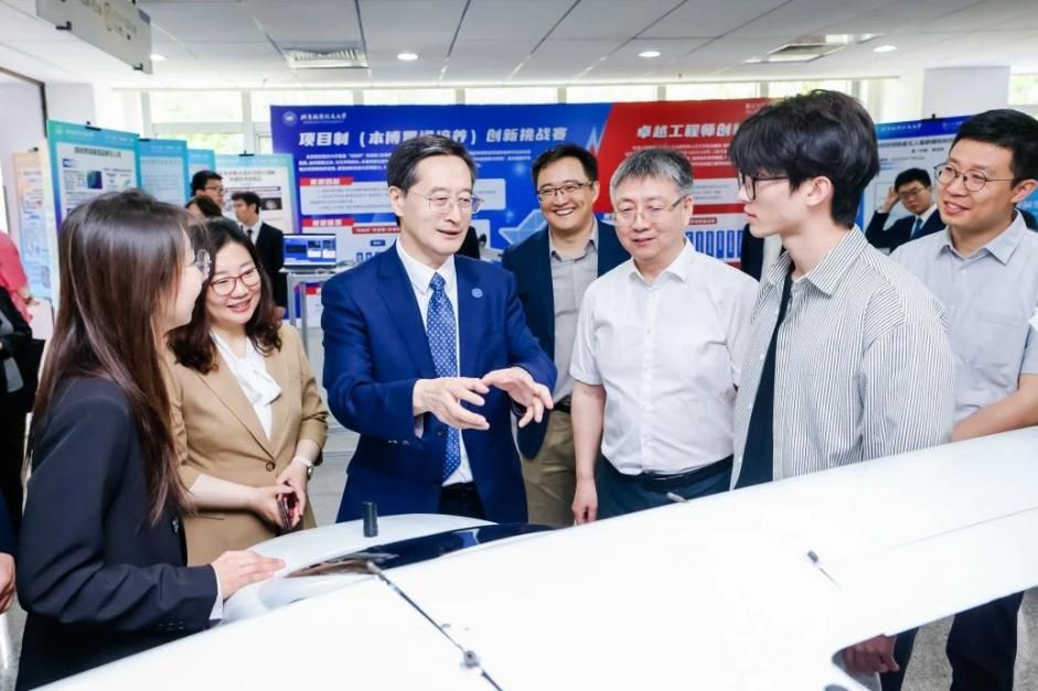 5月18日上午,校长王云鹏、副校长邓怡莅临我院作品展区,在校团委书记刘洋,交通学院党委书记杨世春的陪同下,与交通学子参赛代表展开亲切交流,听取了关于飞行汽车、元镜智鉴项目的介绍,鼓励大家在科研道路上不断挑战自我,不断激发创新活力。王云鹏校长指出,空天科技的发展离不开多元融合和系统思维,希望同学们在科技创新的道路上不断拓展视野、打破壁垒,携手共绘未来交通的宏伟蓝图。